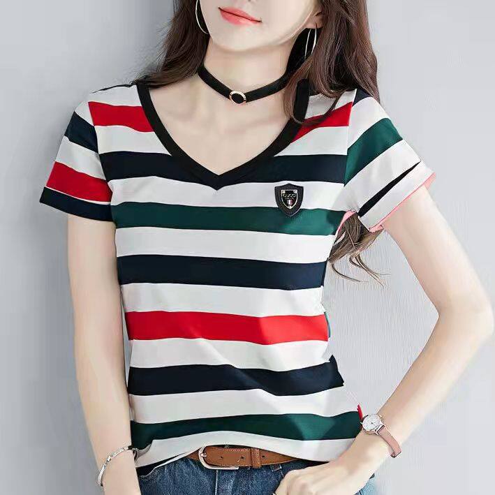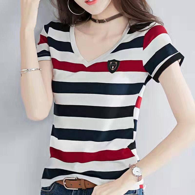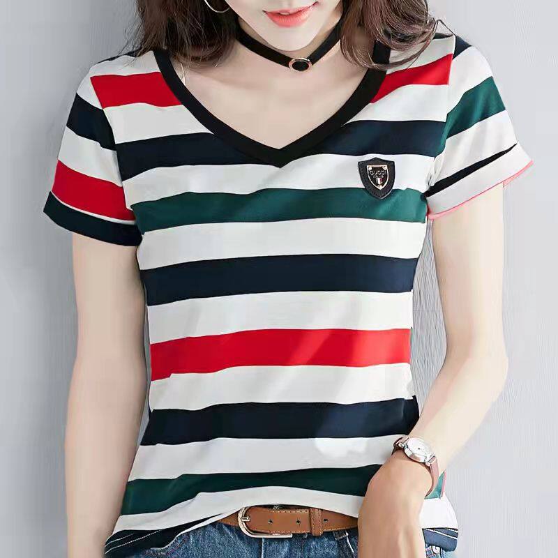 100% cotton Korean New fashion lady Cotton Short-sleeved Stripe T-shirt Women Slim Thin Large Size V-neck Half-sleeve Tee Summer Top
