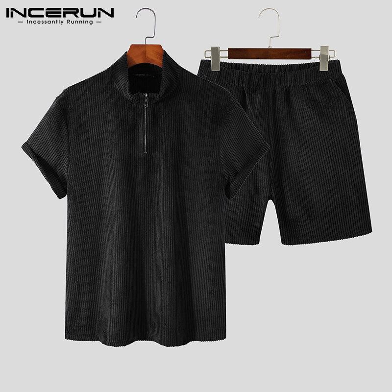 Beehoo INCERUN Mens Short Sleeve Zip Up Sets Shorts Suits Fit Sleepwear Underwear(Western Style)