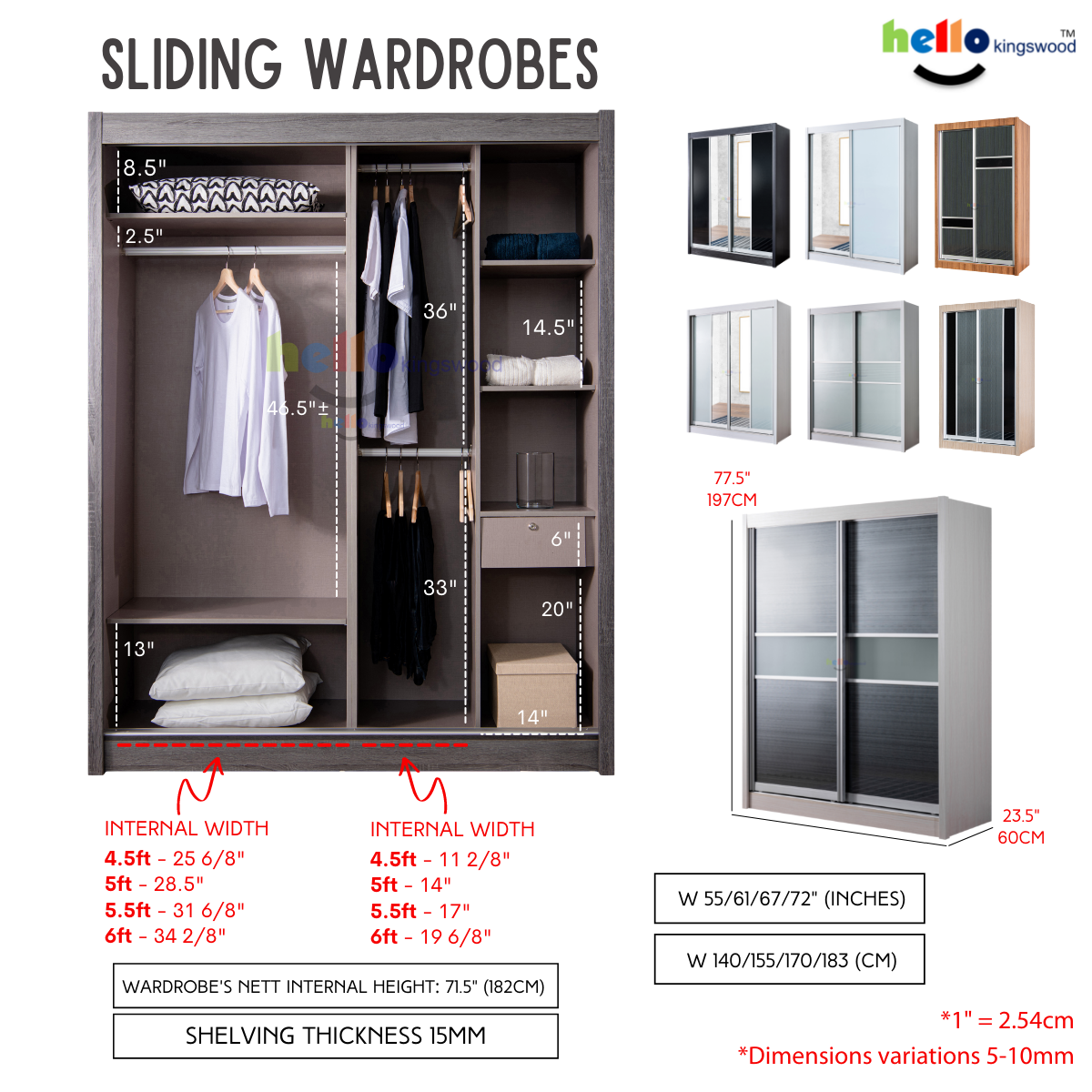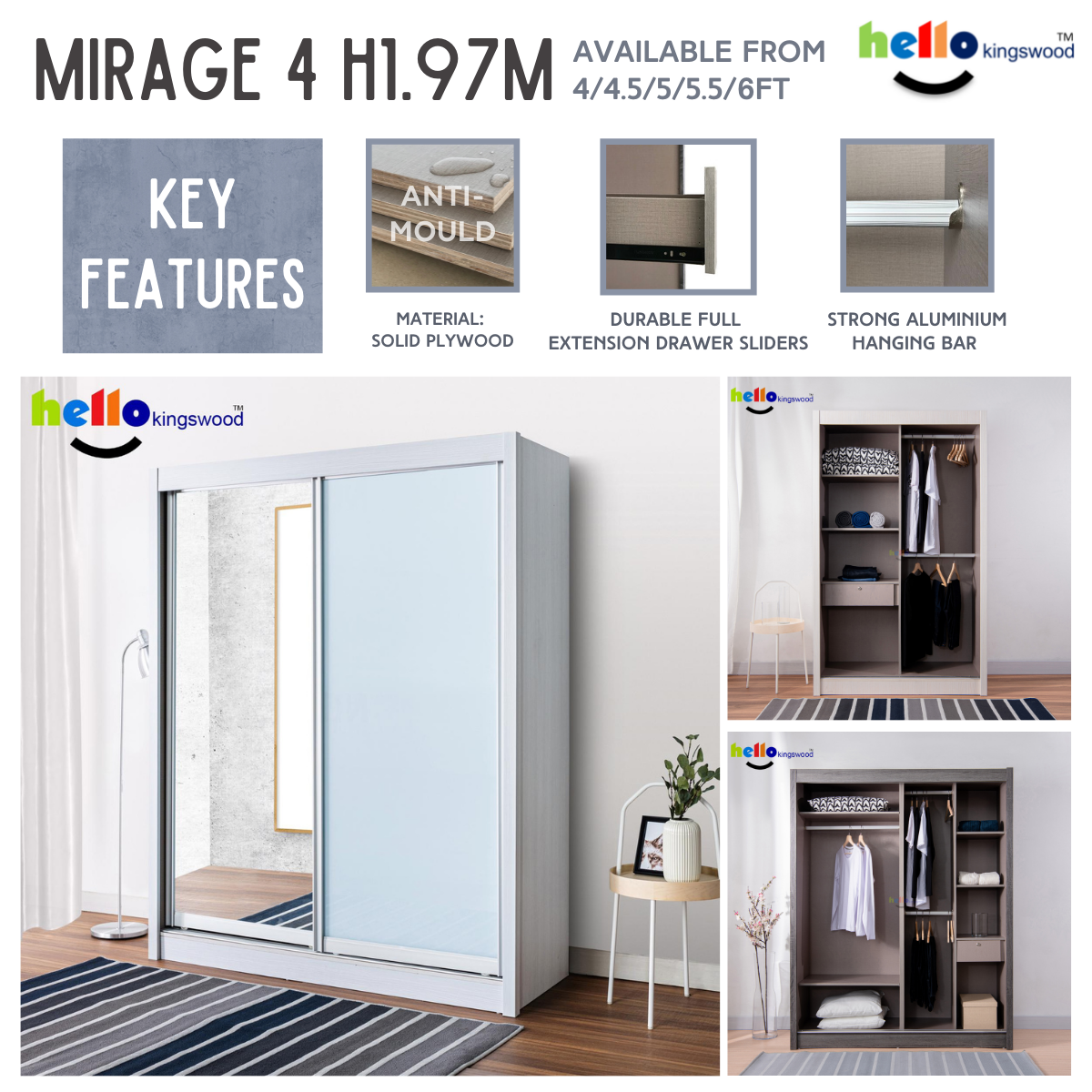 [Kingswood] Mirage 4 Sliding Door Wardrobe, 4 | 4.5 | 5 | 5.5 | 6ft, Solid Plywood, 12 Months Warranty Included, Available in 9 Colours