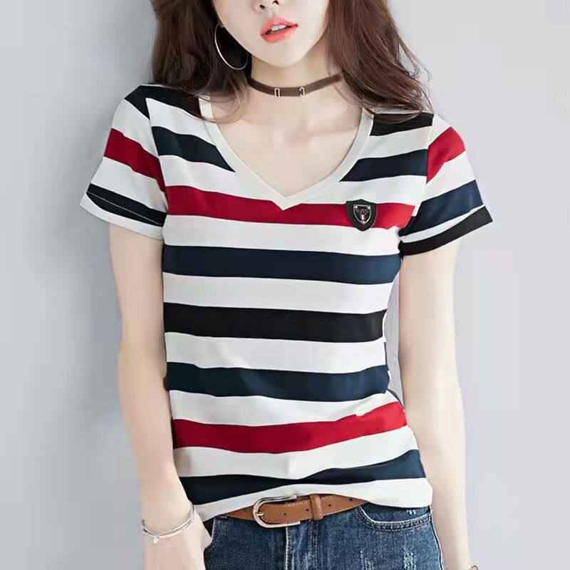 100% cotton Korean New fashion lady Cotton Short-sleeved Stripe T-shirt Women Slim Thin Large Size V-neck Half-sleeve Tee Summer Top